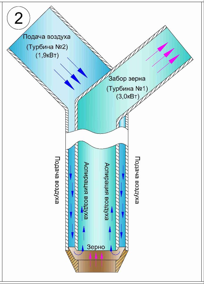"труба в трубе". При этом между внутренней и внешней трубами турбиной нагнетается воздух. Подача этого воздуха - регулируется. В правильно отрегулированном щупе количество нагнетаемого в щуп воздуха равно количеству воздуха, засасываемого основной турбиной, т.е. исключен подсос воздуха и зерна извне. Для примера: проверка правильности регулировки щупа - берется обыкновенный лист бумаги, подносится к входному отверстию щупа, и подача воздуха от нагнетающей турбины
